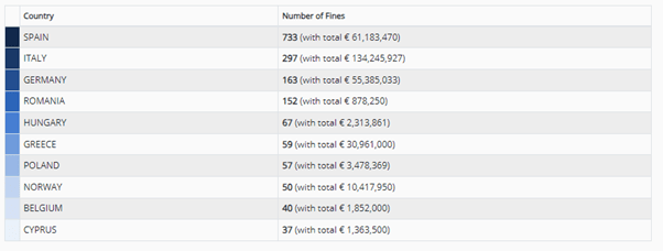 Primera posición: España con 733 multas, muy por encima del resto de puestos (más del doble respecto al segundo puesto). Sin embargo, respecto al importe recaudado por multas impuestas, España no aparece hasta el sexto puesto: